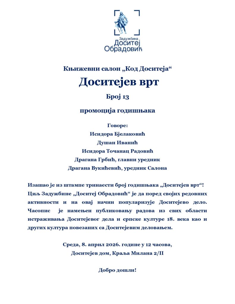 Књижевни салон „Код Доситеја“ – представљање 13. броја Годишњака „Доситејев врт“