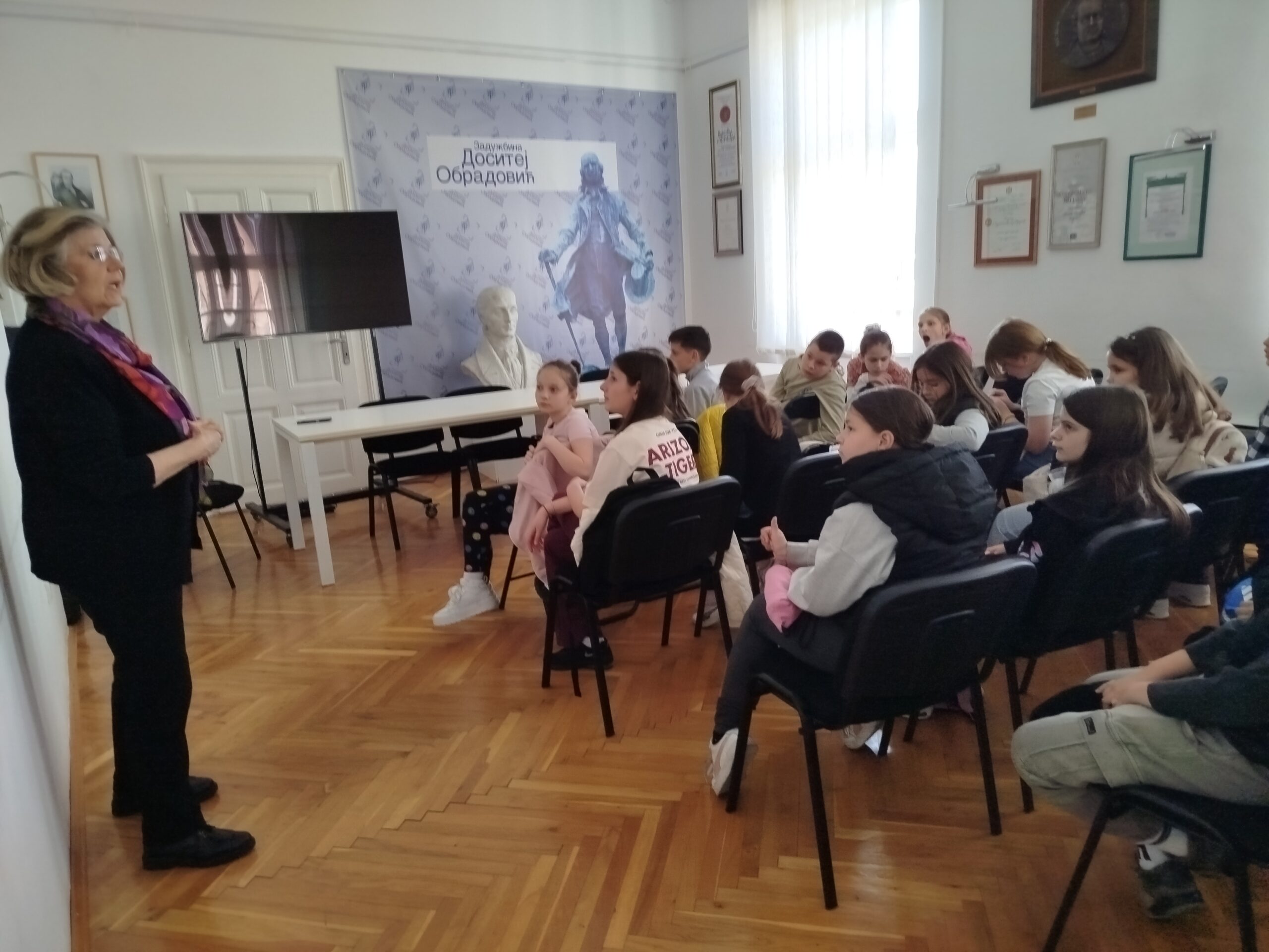 Ђаци су најпре погледали краћи филм о Доситејевом животу, а након тога је Мирјана Драгаш, управник Задужбине, децу упознала са занимљивим животом и делом Доситеја Обрадовића, великог просветитеља. Његов животни пут од малог Чакова код Темишвара, преко манастира Хопово, до великих школа и универзитета у Смирни, Бечу, Лајпцигу, Халеу и других центара европске просвећености тога доба – до Београда и његовог рада у Правитељствујушчем совјету и отварања Велике школе и Прве београдске богословије, заинтересовао је присутне ученике који су обећали да ће учествовати у свим активностима и конкурсима Задужбине!
